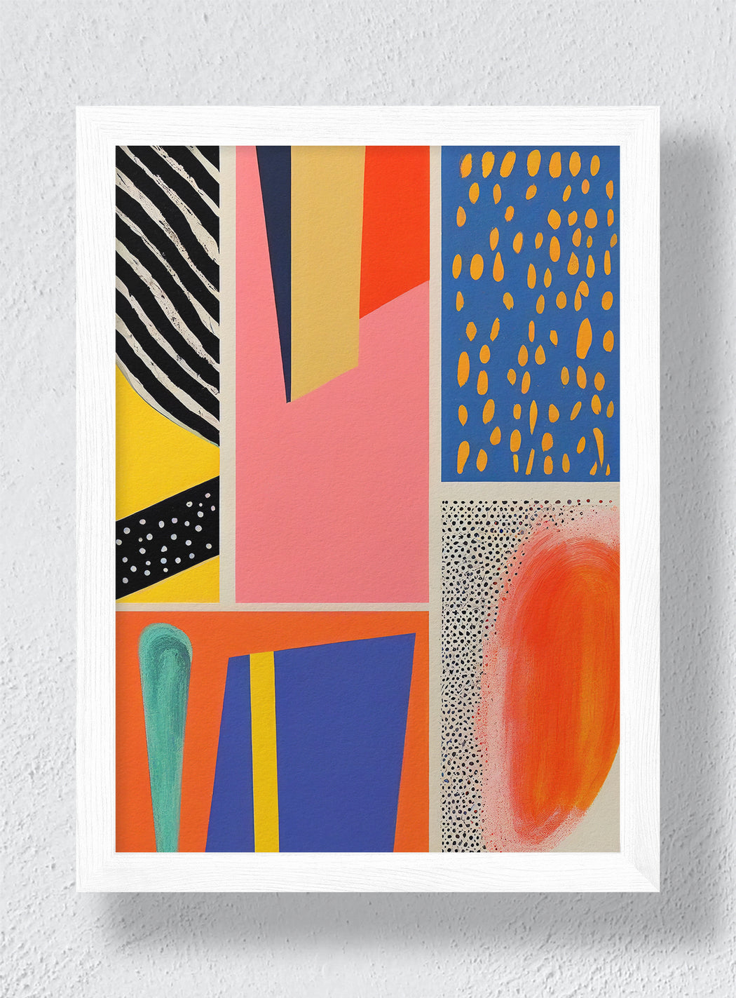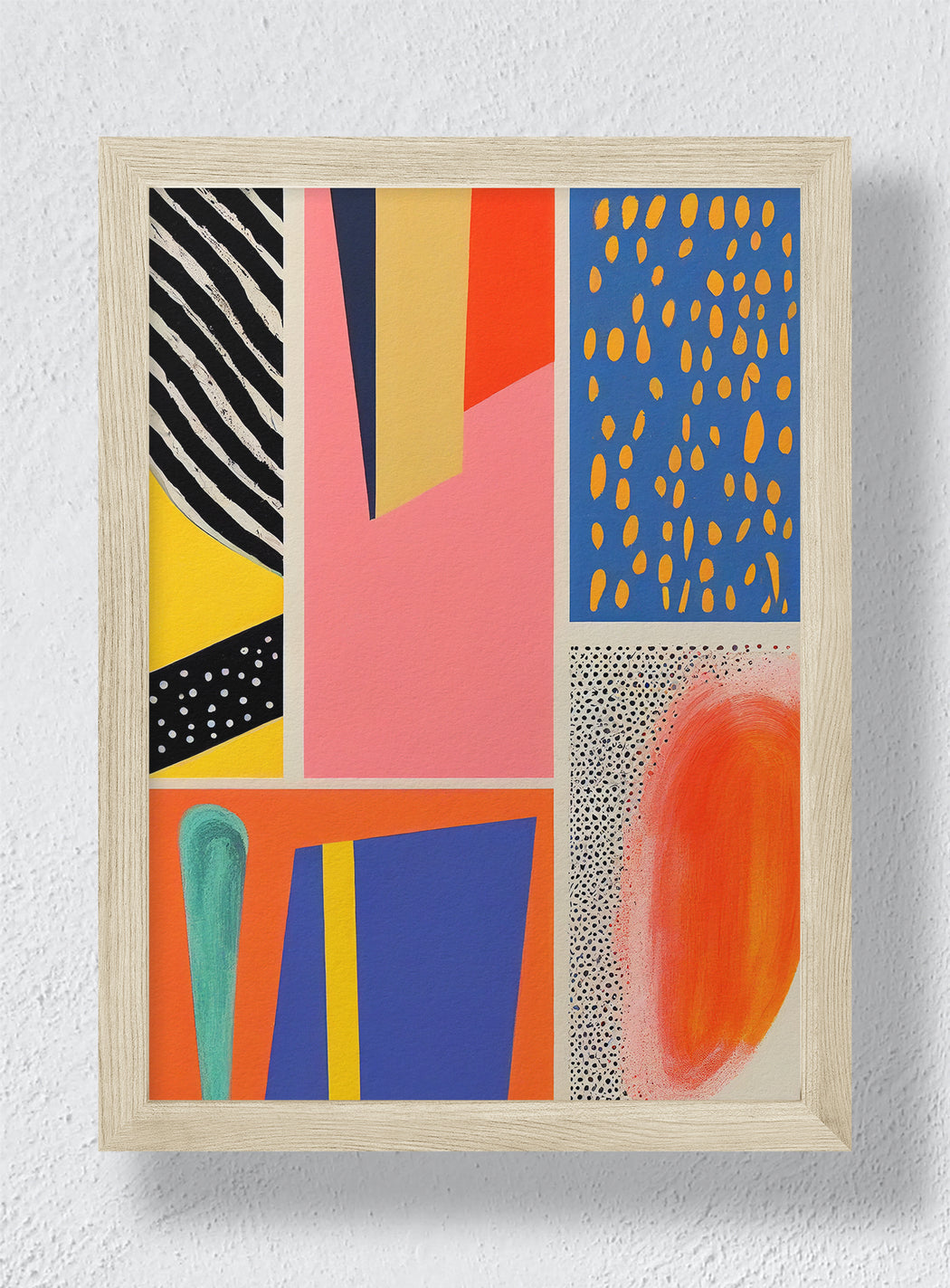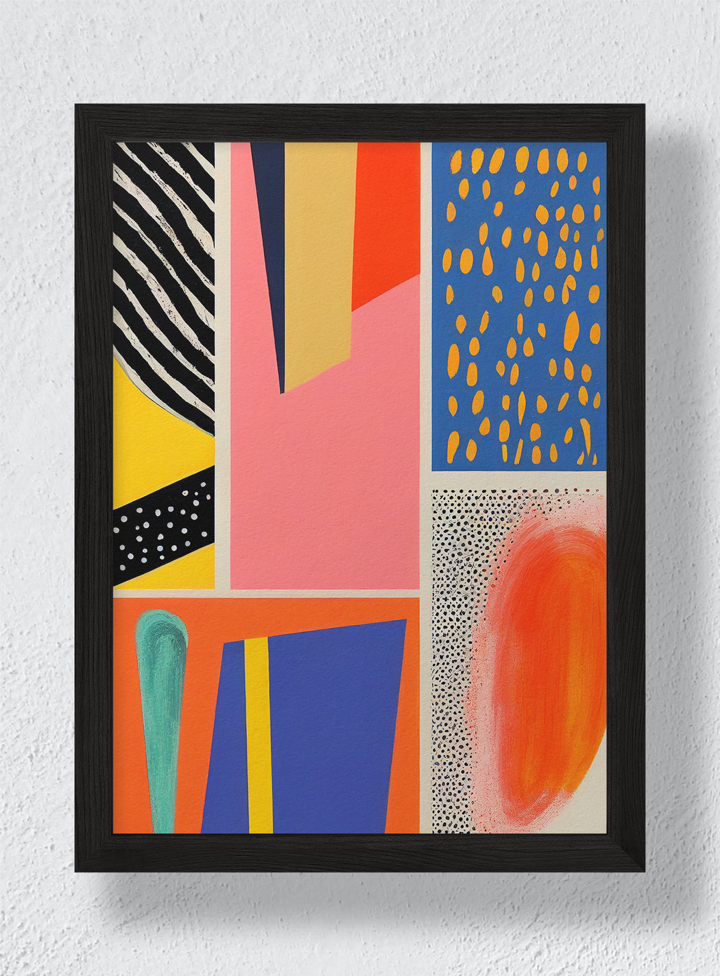"A vibrant tapestry of geometric forms and bold patterns, this artwork bursts with energy and playfulness. The dynamic interplay of shapes and colors invites the viewer to explore its composition, evoking a sense of curiosity and joy. Perfect for bringing life to any modern space, it celebrates creativity and individuality.