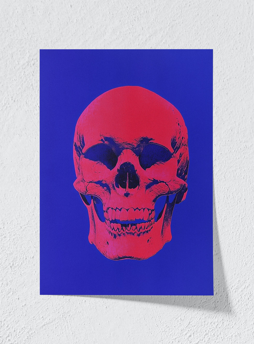 "A striking juxtaposition of vivid neon pink and electric blue, this bold skull design confronts mortality with modern vibrancy, turning the macabre into a captivating celebration of life and art."