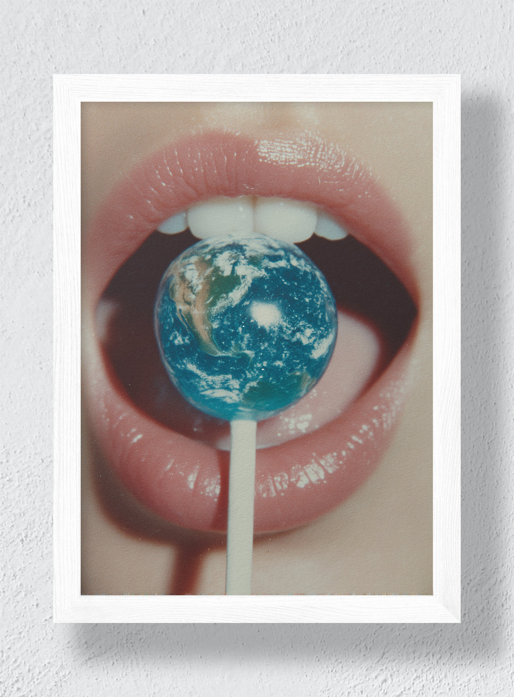 "This work is both playful and catastrophic: the intimacy of lips tasting a world, the absurdity of Earth rendered edible. A meditation on hunger, pleasure, and the inevitability of swallowing the very ground we stand on."