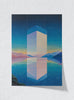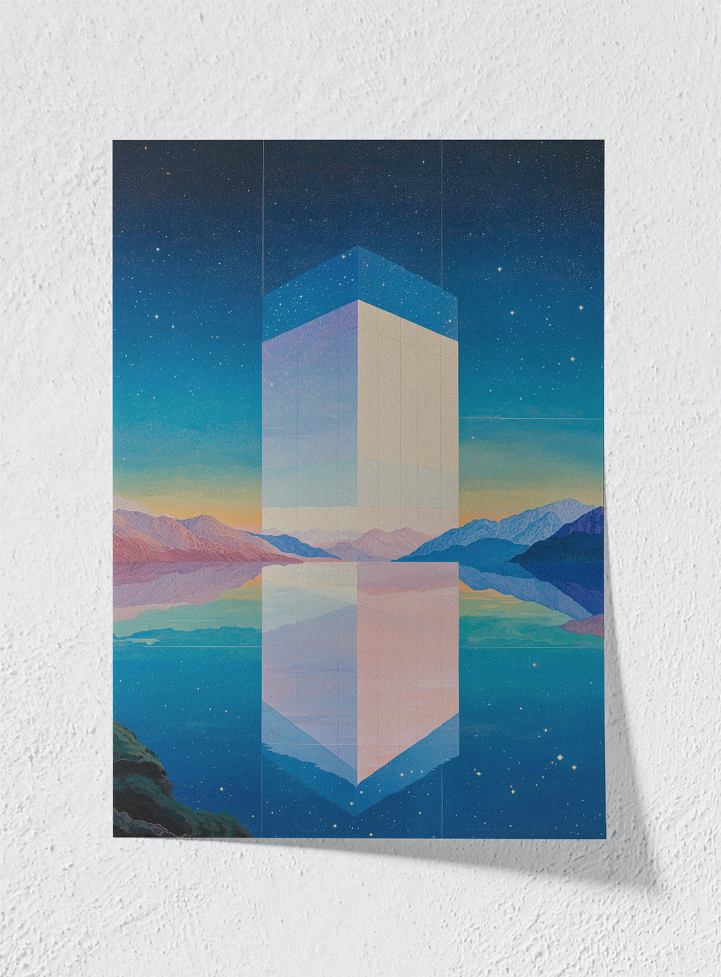 "This captivating artwork presents a surreal interplay between the natural and the ethereal, where a luminous geometric tower reflects perfectly across tranquil waters, surrounded by a dreamlike landscape of twilight hues and starlit skies—an exploration of infinity, serenity, and transcendence.