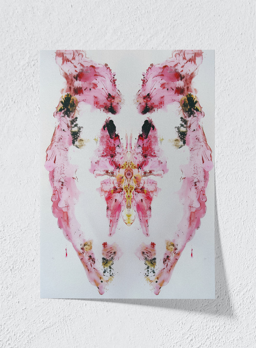 "This vibrant, symmetrical composition fuses abstract expressionism with delicate floral overtones, creating a dynamic visual resembling a blossoming butterfly fused with an inkblot test—inviting the viewer to explore themes of duality, beauty, and interpretation."