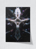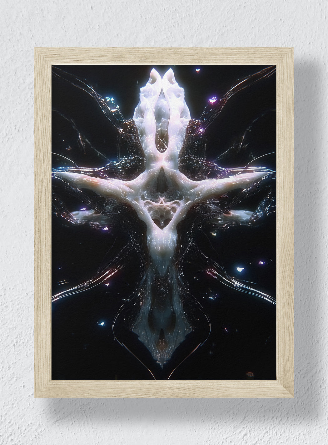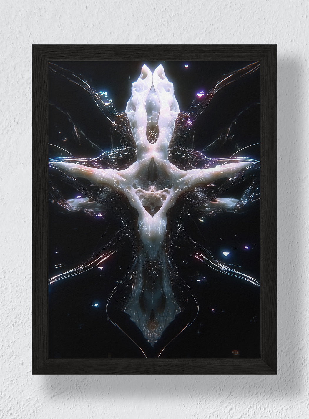 "This artwork conjures an alien divinity — part fluid, part mechanical — suspended in darkness. A spectral monument to forms not yet known. A vision balanced between relic, spirit, and machine."