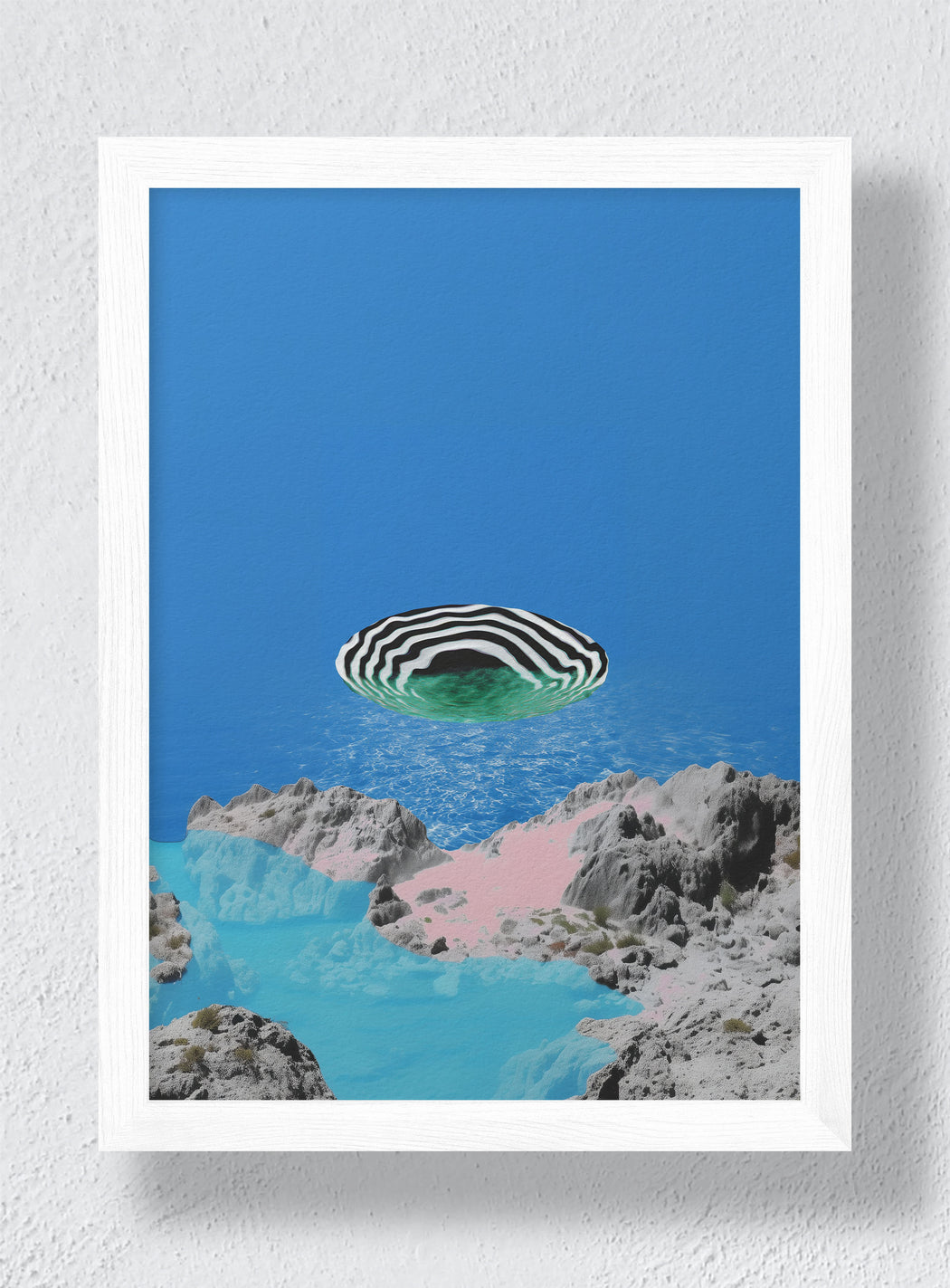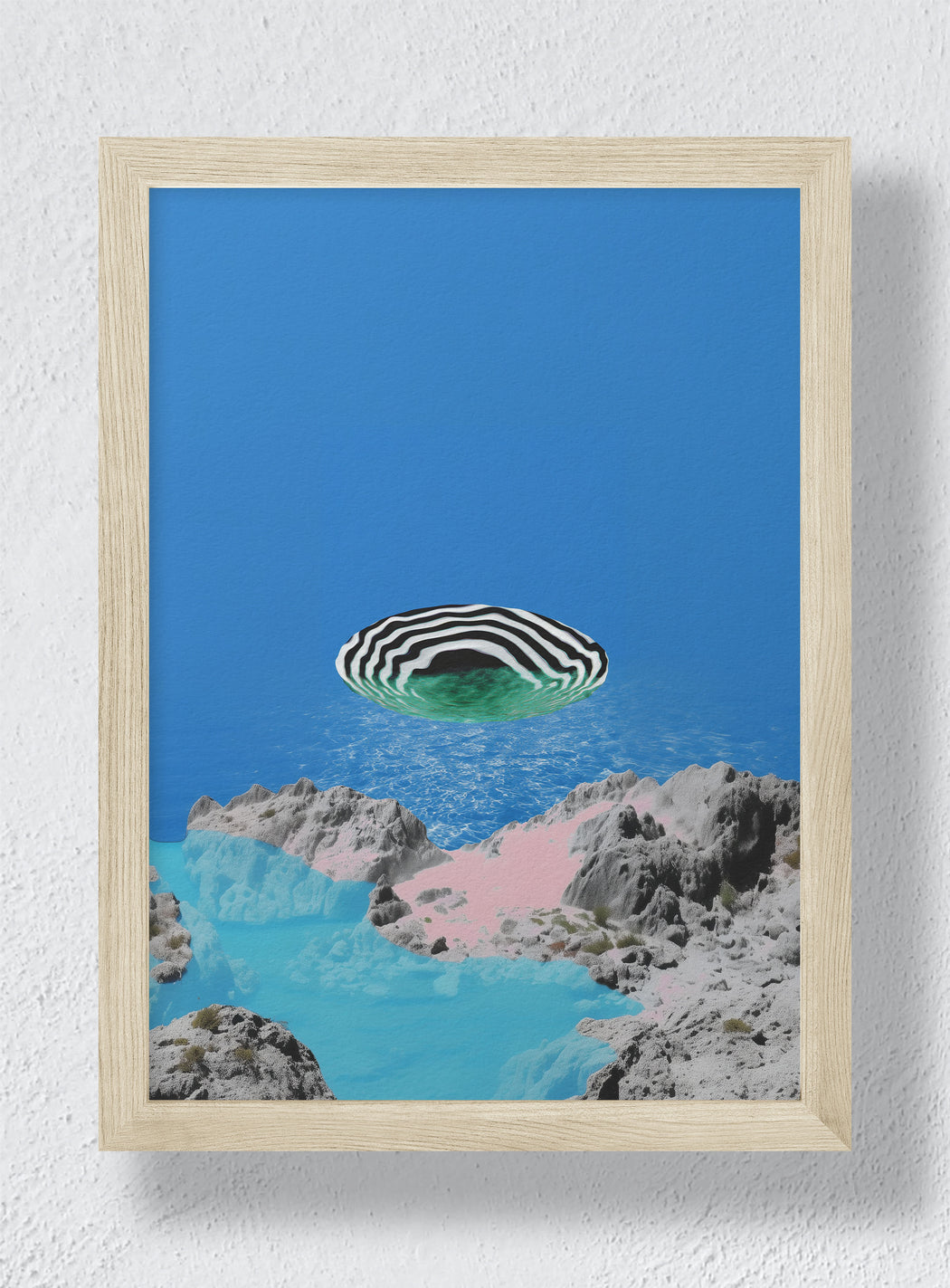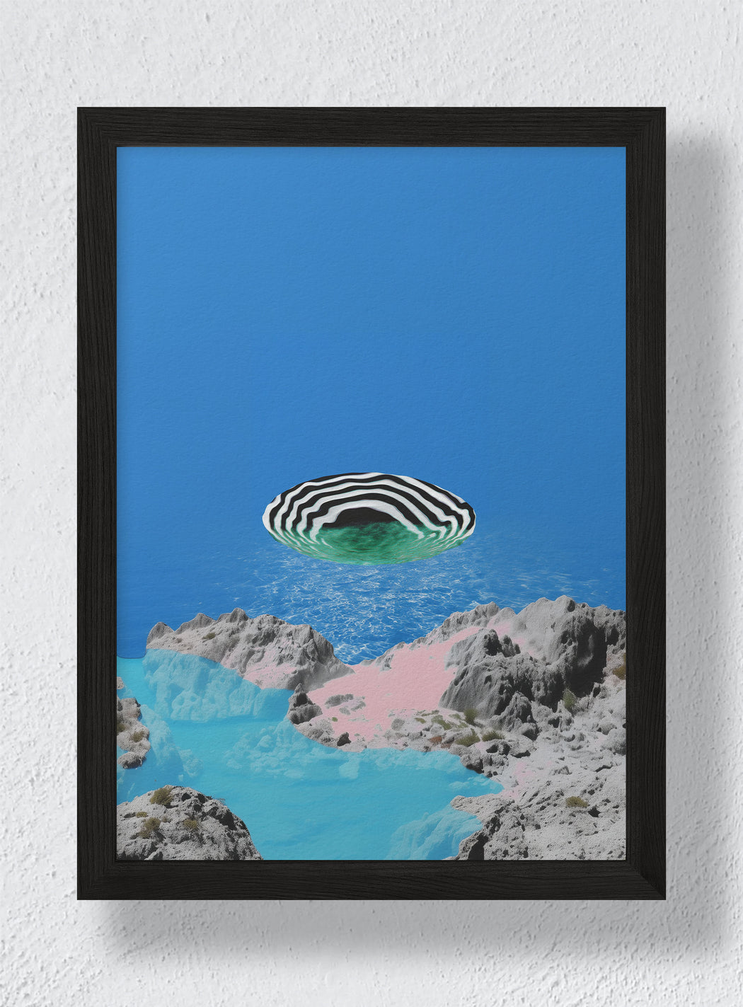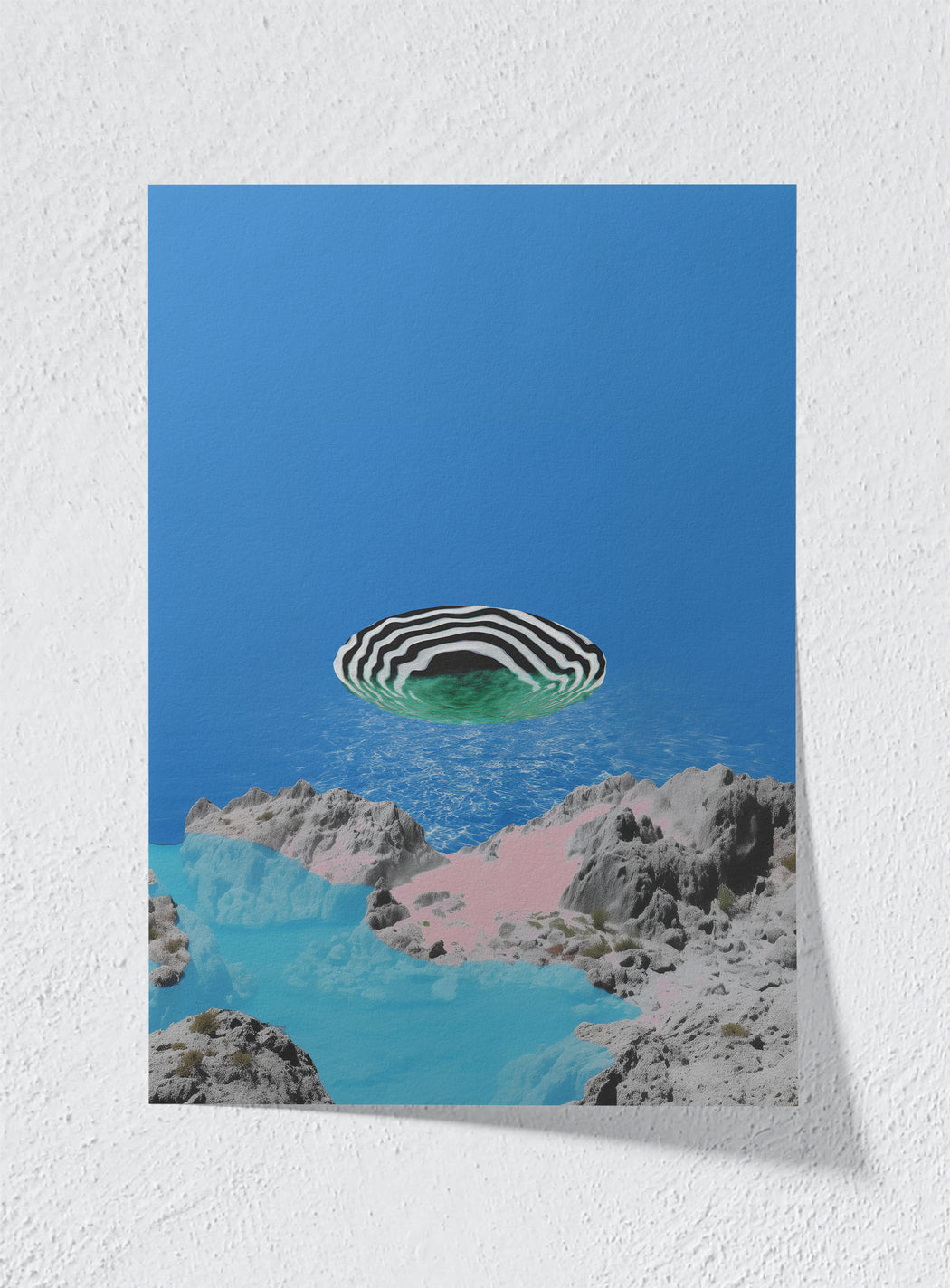 "A hypnotic basin hovers between geological realism and digital illusion. Pink sand, cyan pools, and carved stone converge beneath a floating striped void that seems to inhale the horizon itself. This piece captures the calm tension between solidity and disappearance, a portal disguised as paradise."