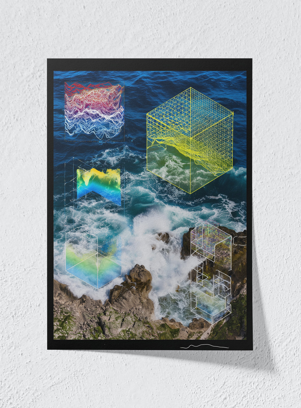 "Across these works, nature, body, and cosmos are filtered through algorithmic sight. The sun is reduced to an icon, the sea becomes a cube of coordinates, the human face dissolves into contour lines. Yet in these fractures lies something mythic: a glimpse of beauty beyond control, where art records not truth but the failure of truth’s machinery."