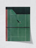 "This aerial snapshot transforms the tennis court into a vast canvas where the interplay of color, lines, and shadow captures the quiet drama of sport. The solitary figure, poised mid-serve, exudes elegance and determination, set against the rich greens and deep reds of the court, evoking a sense of focus amidst stillness."