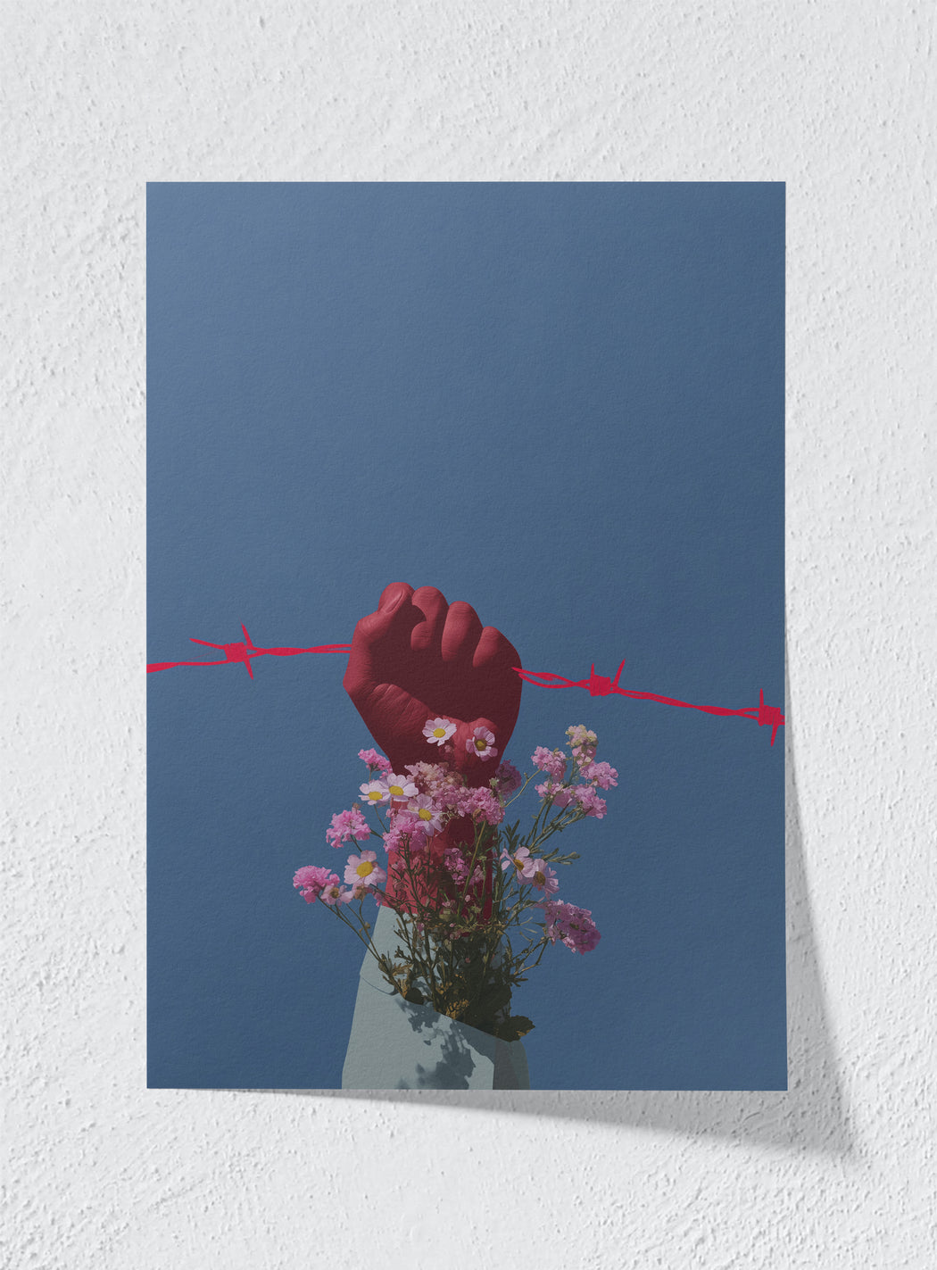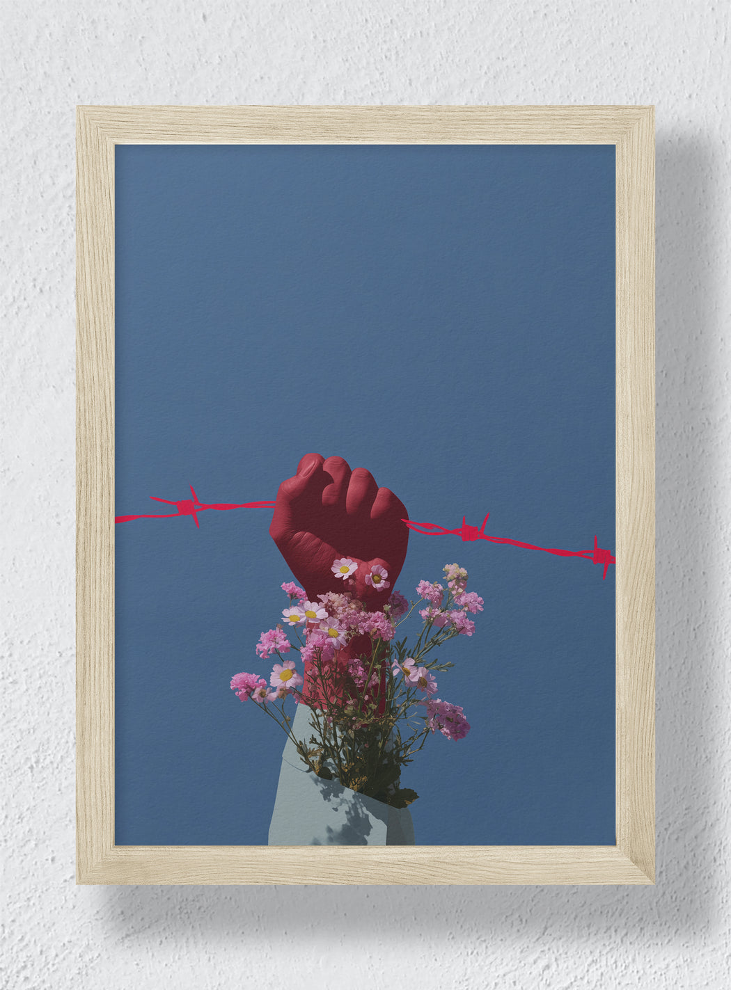 "A fist grips barbed wire, yet flowers bloom defiantly from its grasp. A bold depiction of beauty resisting brutality, strength entwined with fragility."